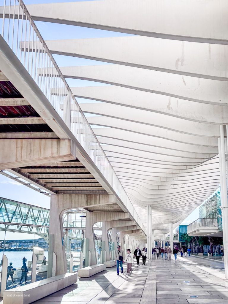 Palmeral de las Sorpresas, czyli nowoczesna promenada przy samym nabrzeżu portowym. Wspaniale zaprojektowana, wygląda jak architektoniczna zabawa światłem i cieniem. Nad deptakiem wybudowane zostały białe, falujące konstrukcje zadaszenia. Trochę jak żagle, trochę jak rzeźby. Dają cień, tworzą rytm. Wzdłuż promenady rosną palmy, a obok kołyszą się jachty. Jest pięknie.