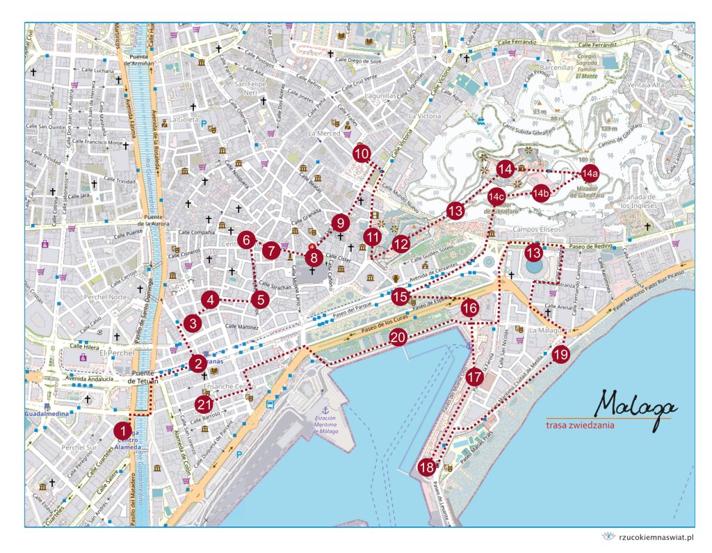 Jednak, gdy już dotrzecie do pięknej Malagi, nie traćcie cennego czasu na poszukiwanie miejsce ciekawych turystycznie. Polecamy Wam skorzystać z przygotowanej przez nas trasy zwiedzania. Ujęliśmy na niej najbardziej znane i popularne punkty miasta, ciekawe miejsca i punkty widokowe, a całość uporządkowaliśmy tak, by trasa była jak najbardziej optymalna i efektywna. Zerknijcie na nią. Miejscówki uporządkowaliśmy w taki sposób, by droga była wygodna i ciekawa. Miejsca krótko opisaliśmy, ponieważ spacerując odczujecie emocje, a resztę doczytacie sobie na miejscu. Rozglądajcie się, bo Malaga to miejsce, które jak muzeum, w każdym zakątku ukrywa malownicze perełki.